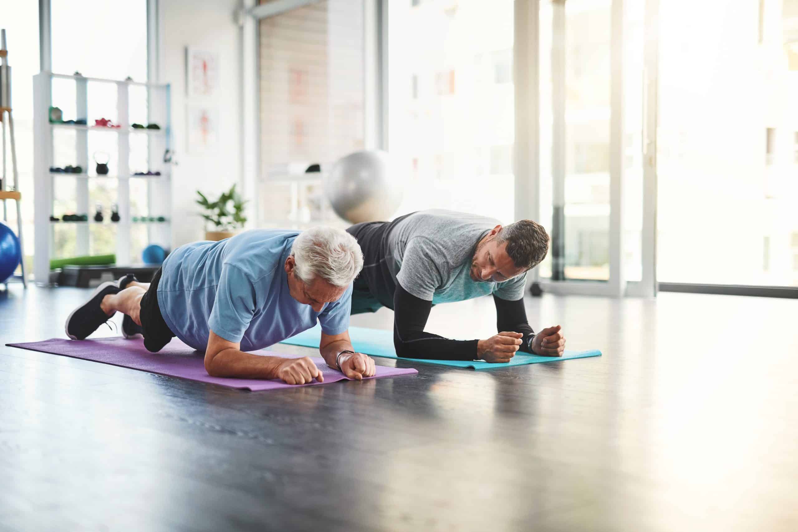 « terug naar vorige pagina Physical therapy, class and senior man with exercise for mobility, recovery and training in retirement. People, lesson and physio with plank on floor for rehabilitation, support and joint strength